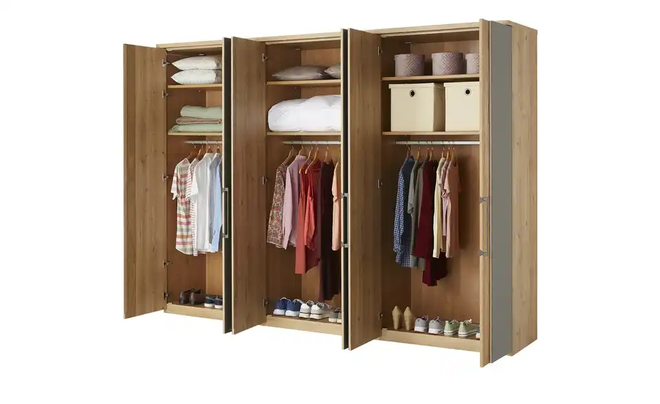 - Lieferumfang / mitgeliefertes Zubehör2 Einlegeböden je Element1 Kleiderstange je ElementKranzleiste mit LED-BeleuchtungLED-Beleuchtung für Außentüren