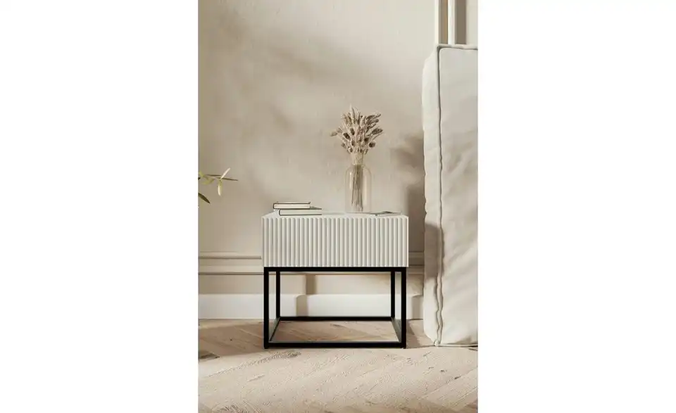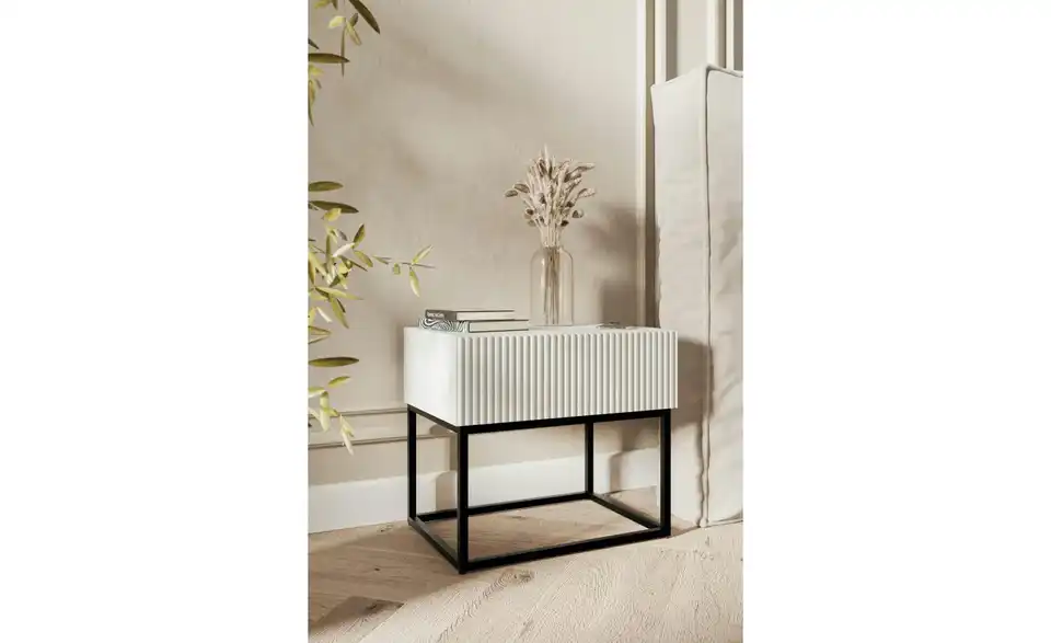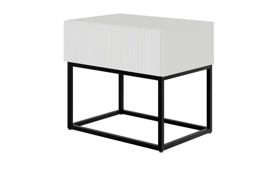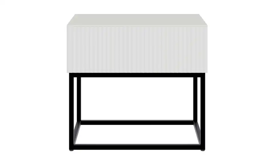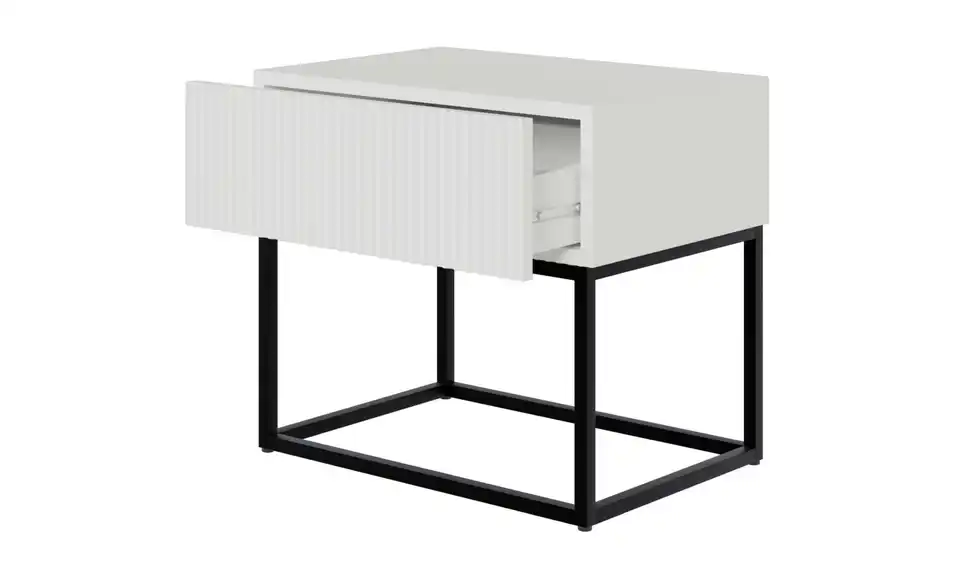 - Lieferumfang / mitgeliefertes ZubehörWeißer Nachttisch mit schwarzem Kufengestell