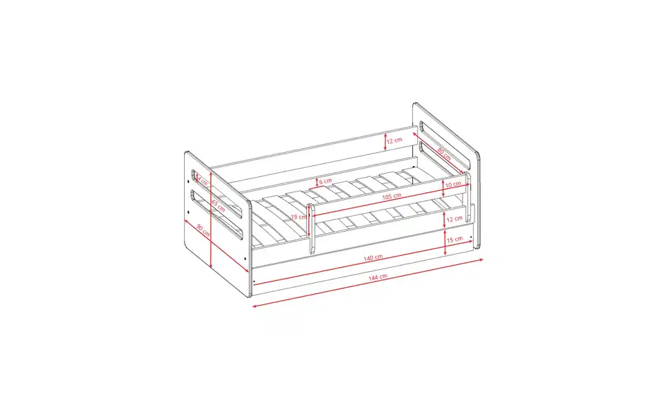 - Lieferumfang / mitgeliefertes ZubehörMontagesatz (Schrauben, Dübel), Matratzenrahmen, Schubladenführungen, Matratze