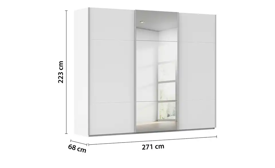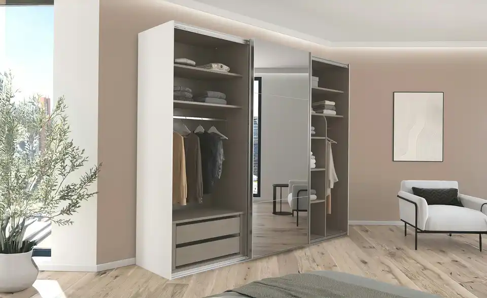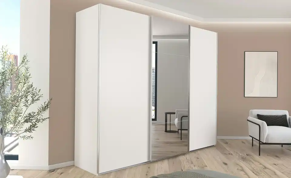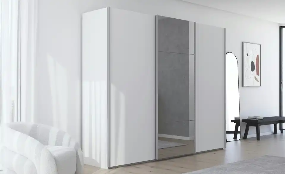 - Mehr zu AusführungDreitüriger Schwebetürenschrank mit Spiegel inkl. ZubehörBestehend aus drei Elementen (je ca. 90 cm breit)