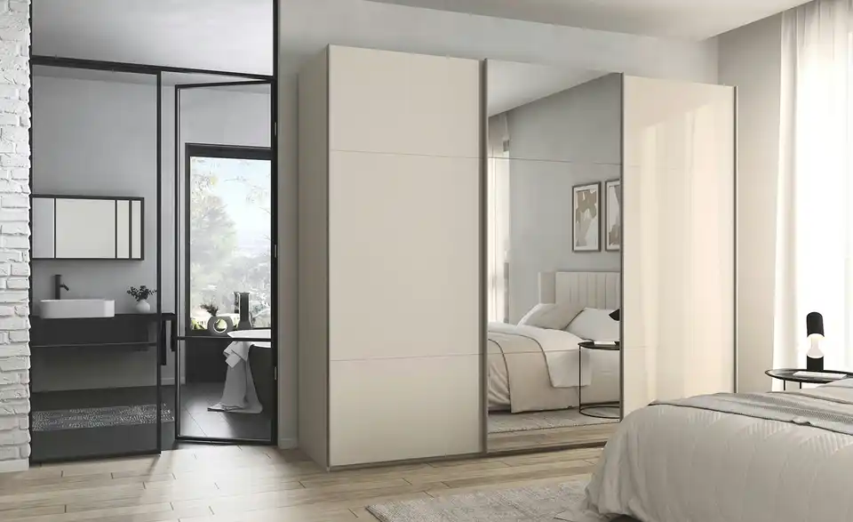 - Mehr zu AusführungDreitüriger Schwebetürenschrank mit Spiegel inkl. ZubehörBestehend aus drei Elementen (je ca. 90 cm breit)