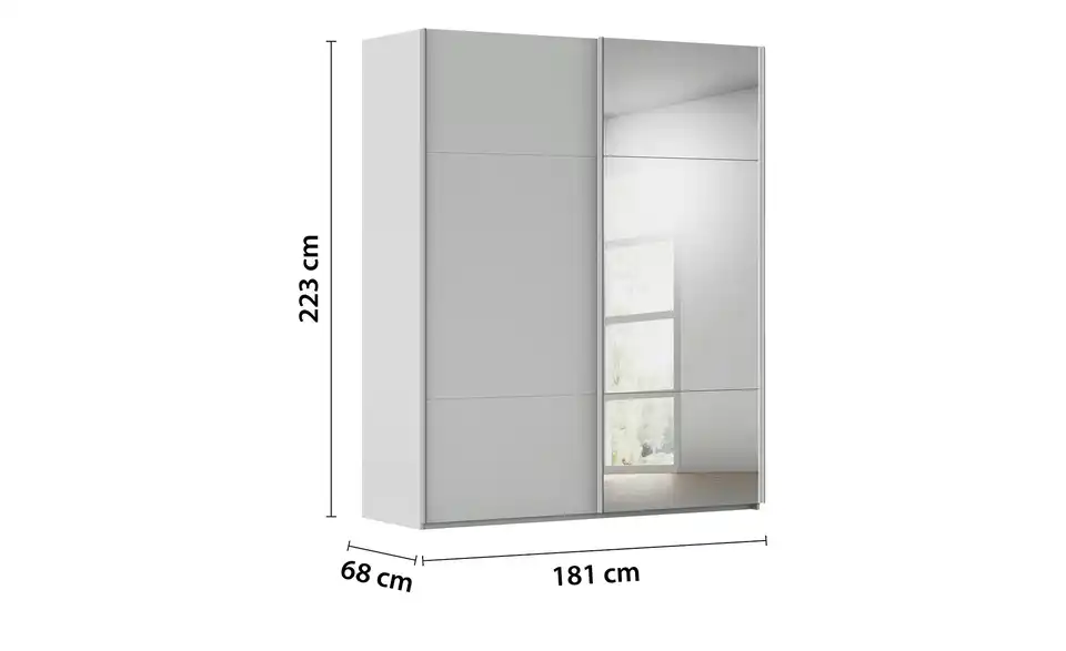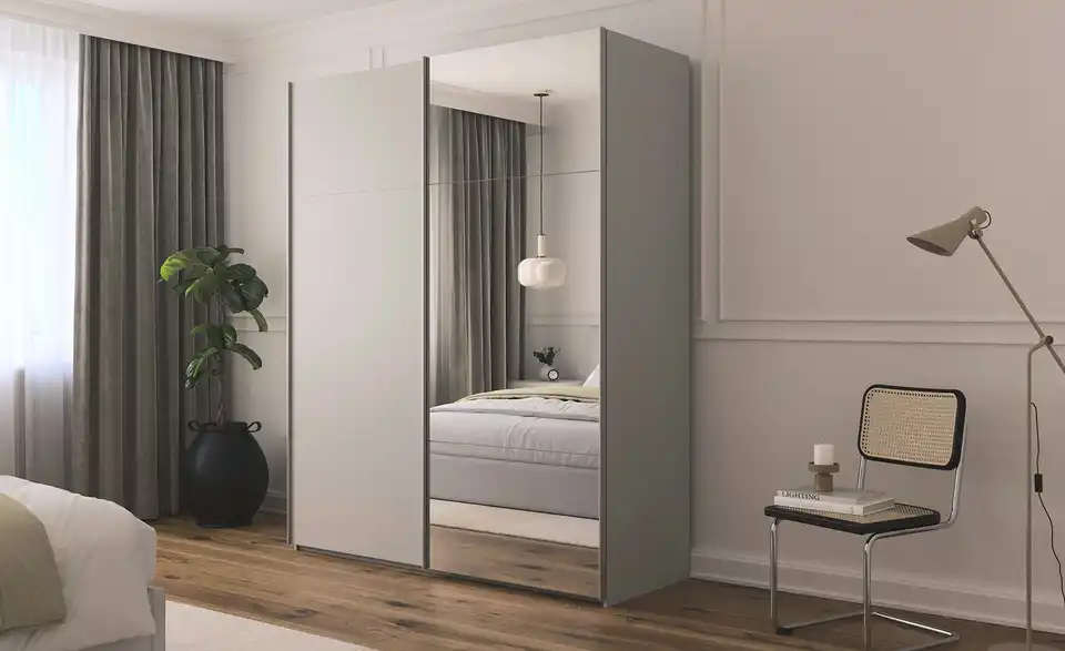 - Mehr zu AusführungZweitüriger Schwebetürenschrank mit Spiegel inkl. ZubehörBestehend aus zwei Elementen (je ca. 90 cm breit)