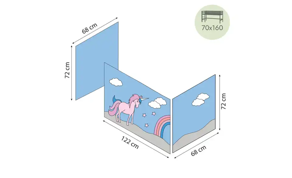 - Lieferumfang / mitgeliefertes ZubehörVorhang für die Seiten und die Front des Kinderbetts mit Aufhängung - für Kinderbetten mit Liegefläche 70x160 und Höhe unter dem Bett ca. 70 cm