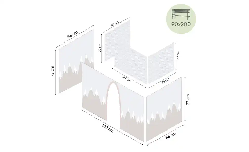 - Lieferumfang / mitgeliefertes ZubehörVorhang für die Seiten und die Front des Kinderbetts mit zusätzlichem Tüll-Vorhang und Aufhängung - für Kinderbetten mit Liegefläche 90x200 und Höhe unter dem Bett ca. 70 cm