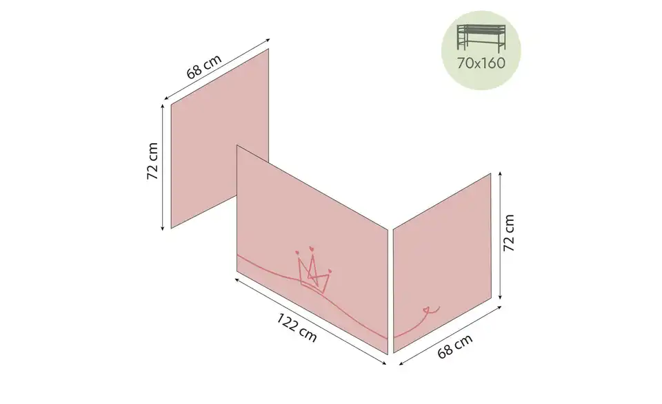 - Lieferumfang / mitgeliefertes ZubehörVorhang für die Seiten und die Front des Kinderbetts mit Aufhängung - für Kinderbetten mit Liegefläche 70x160 und Höhe unter dem Bett ca. 70 cm