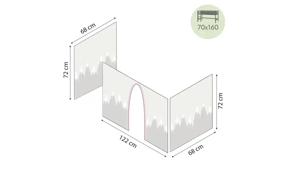 - Lieferumfang / mitgeliefertes ZubehörVorhang für die Seiten und die Front des Kinderbetts mit Aufhängung - für Kinderbetten mit Liegefläche 70x160 und Höhe unter dem Bett ca. 70 cm