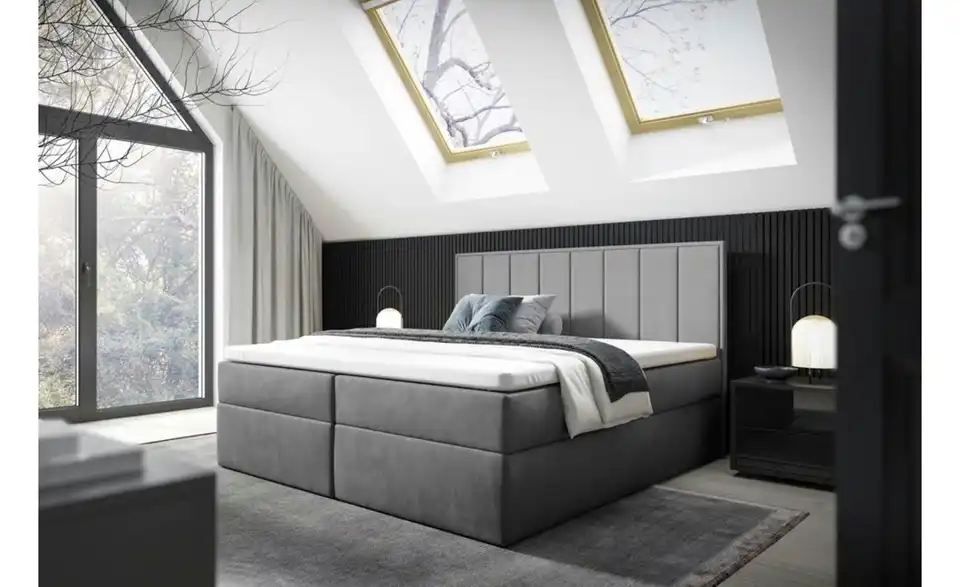 - Ausstattung / FunktionBettkastenöffnung linksBettkastenöffnung rechtsinnen liegender Bettkastenmit GasdruckfederKopfteil rundherum bezogen