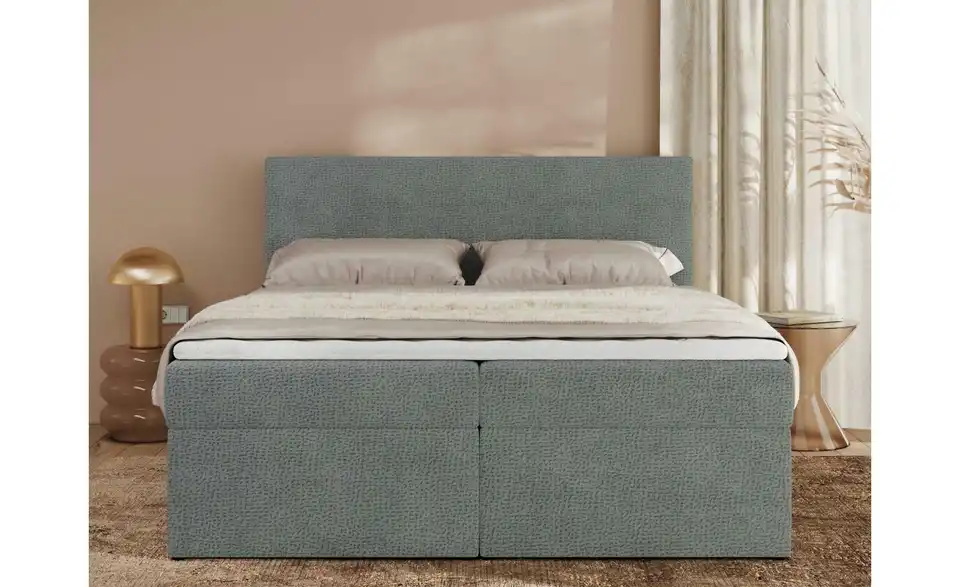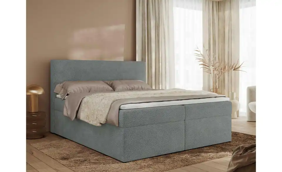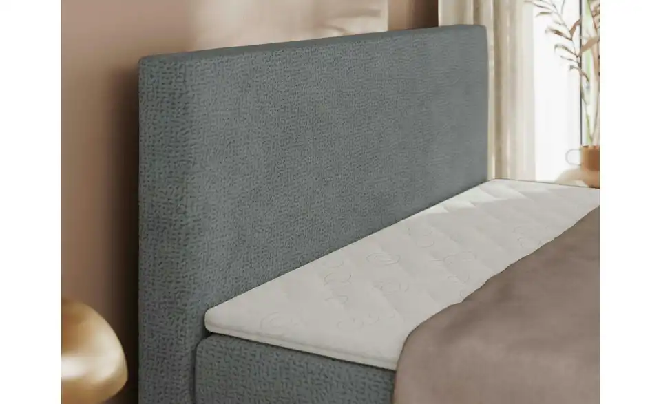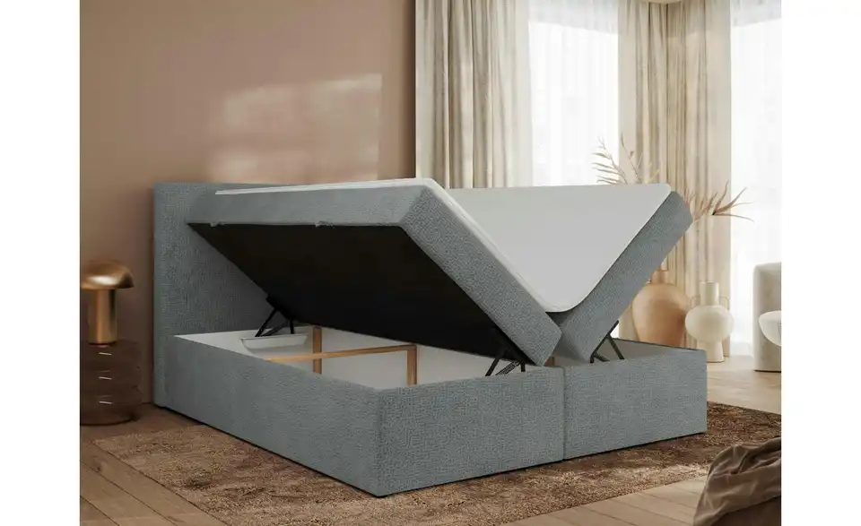 - Lieferumfang / mitgeliefertes ZubehörGraues Polsterbett mit Bettkasten 180x200 cm