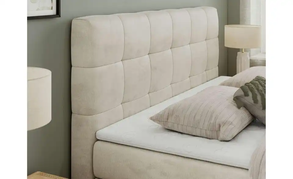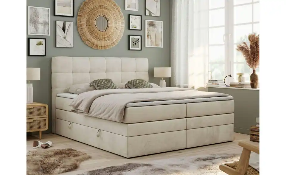 - Lieferumfang / mitgeliefertes ZubehörCremefarbenes Boxspringbett mit Bettkasten 120x200 cm
