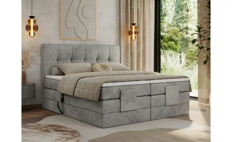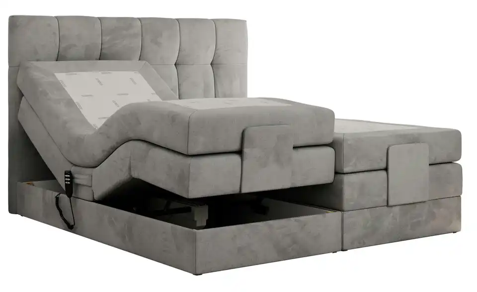 - Lieferumfang / mitgeliefertes ZubehörSilbergraues Motor-Boxspringbett mit Bettkasten 180x200 cm
