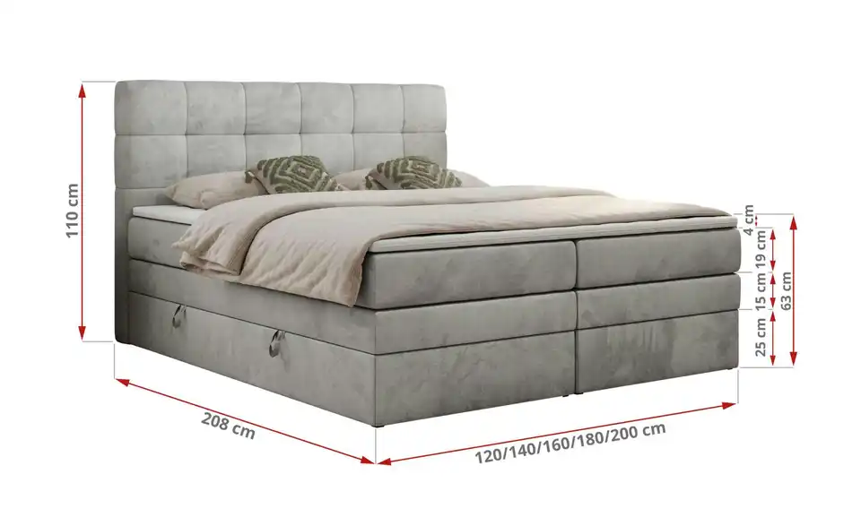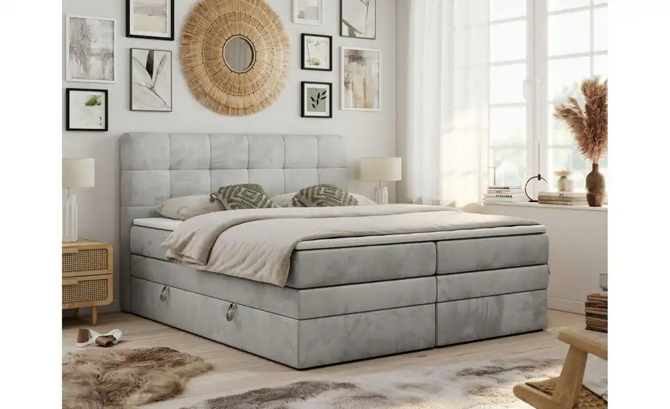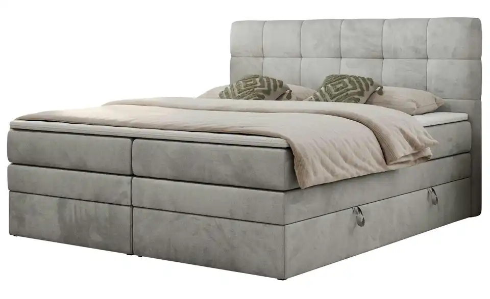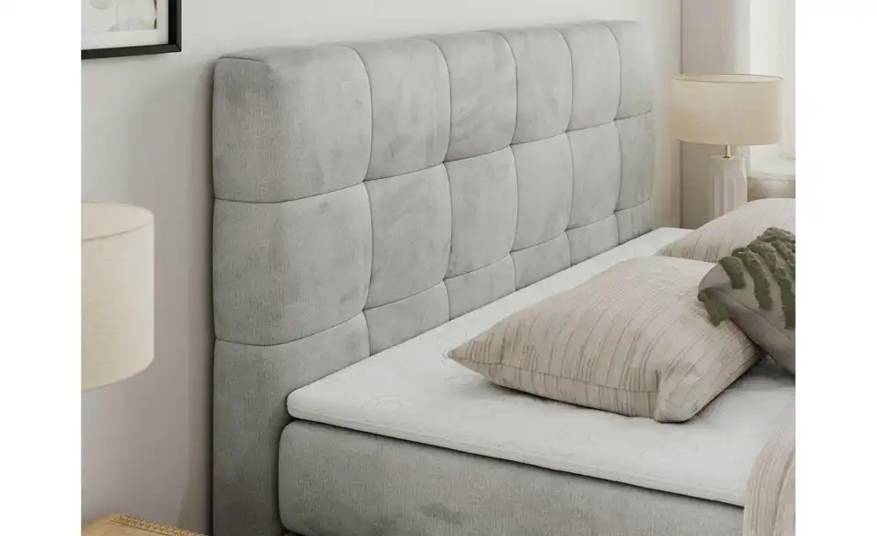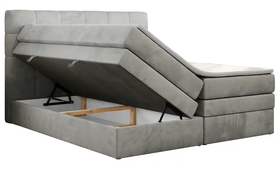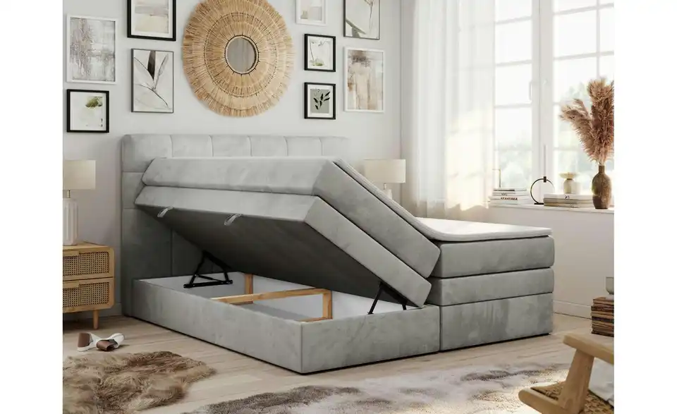 - Lieferumfang / mitgeliefertes ZubehörSilbergraues Boxspringbett mit Bettkasten 120x200 cm