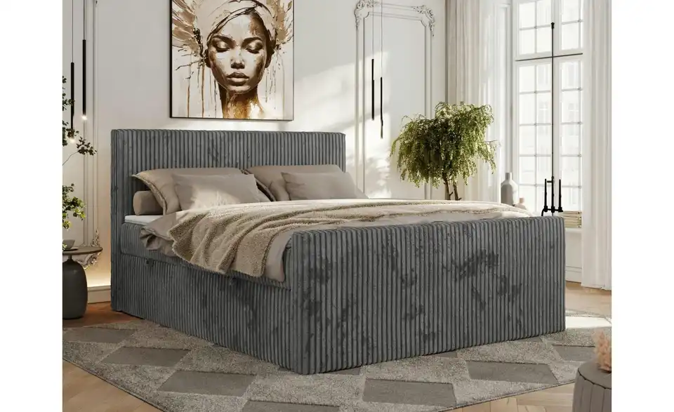 - Lieferumfang / mitgeliefertes ZubehörDunkelgraues Polsterbett mit Bettkasten 140x200 cm