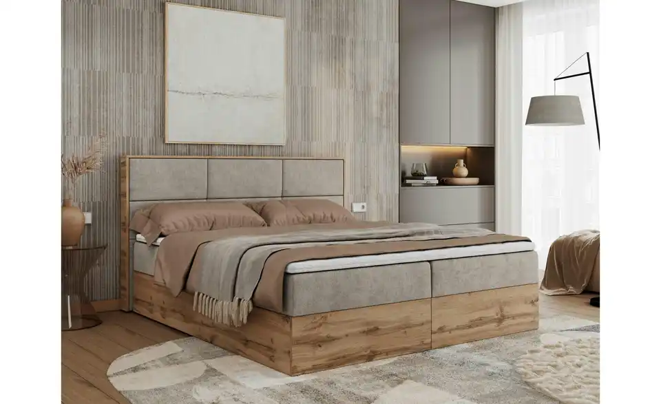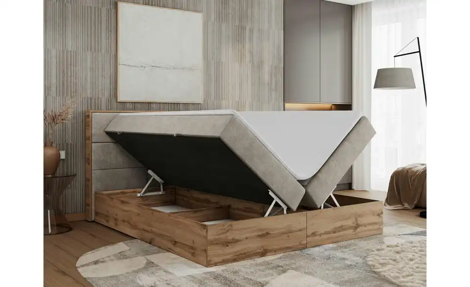 - Lieferumfang / mitgeliefertes ZubehörBeiges Polsterbett mit Bettkasten 180x200 cm
