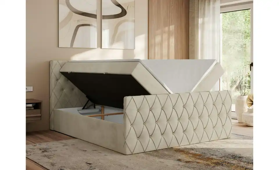 - Lieferumfang / mitgeliefertes ZubehörCremefarbenes Polsterbett mit Bettkasten 120x200 cm
