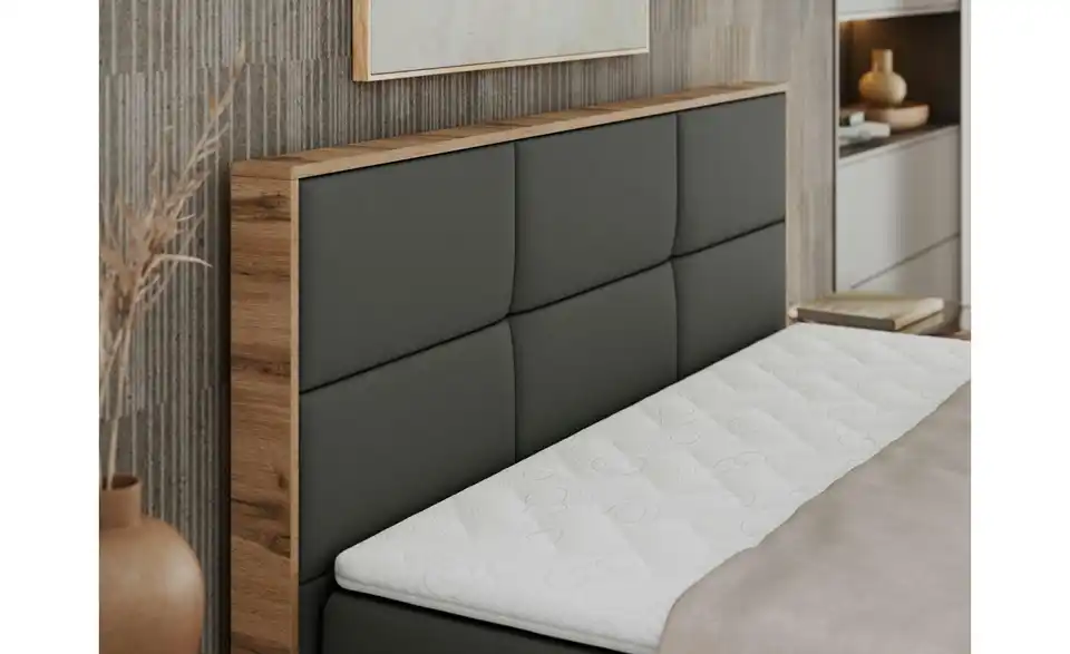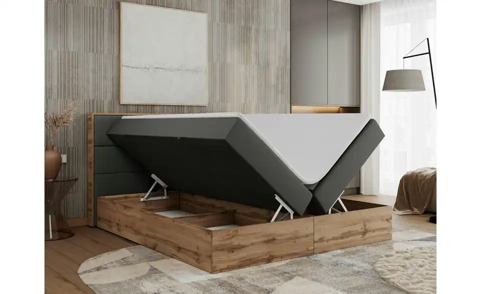 - Lieferumfang / mitgeliefertes ZubehörAnthrazitfarbenes Polsterbett mit Bettkasten 180x200 cm