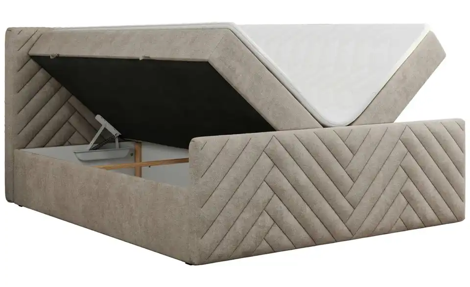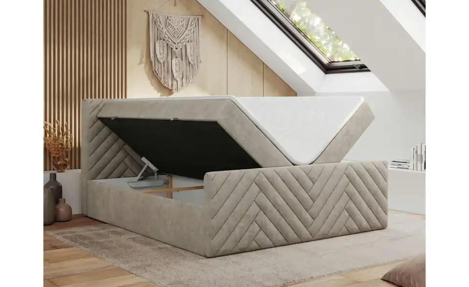 - Lieferumfang / mitgeliefertes ZubehörBeiges Polsterbett mit Bettkasten 180x200 cm