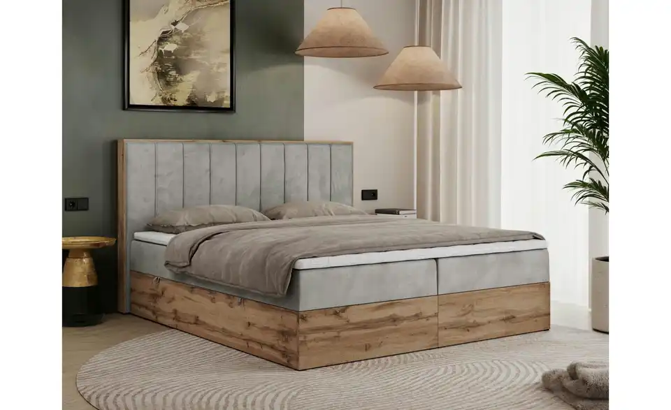 - Lieferumfang / mitgeliefertes ZubehörSilbergraues Polsterbett mit Bettkasten 140x200 cm