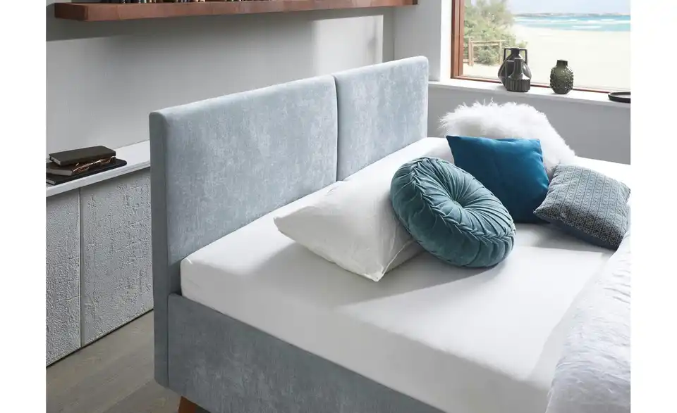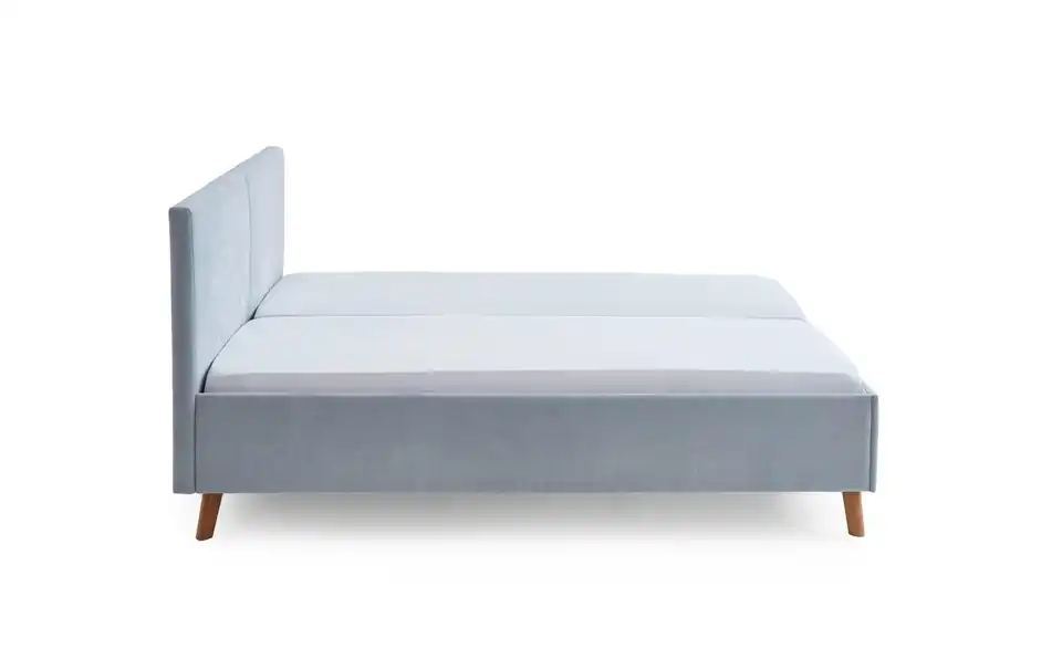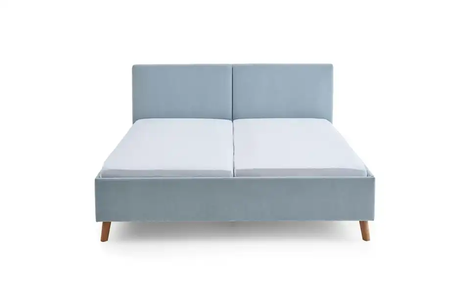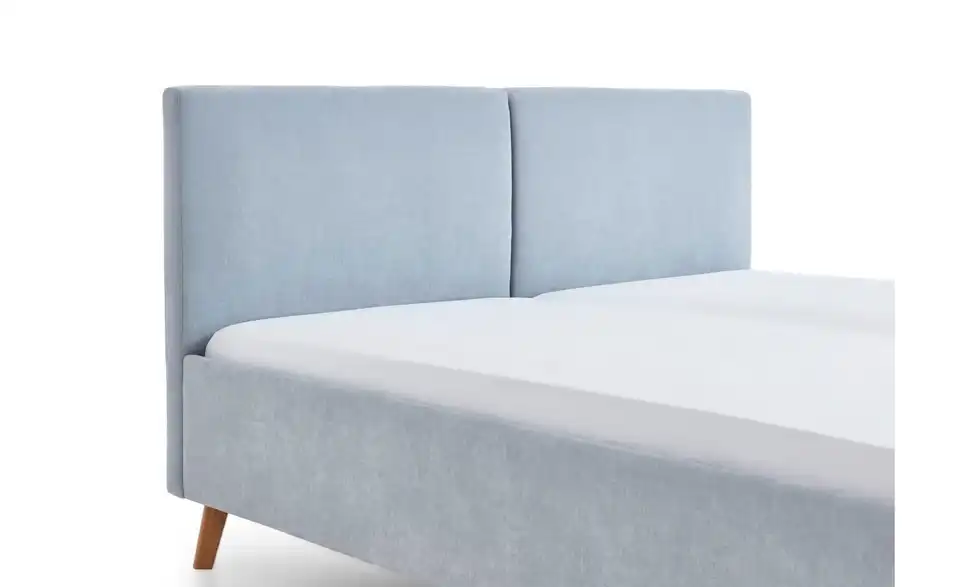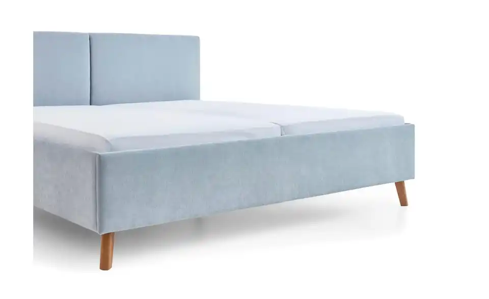 - Lieferumfang / mitgeliefertes ZubehörHellblaues Polsterbett 180x200 cm mit Holzfüßen, eichefarbig