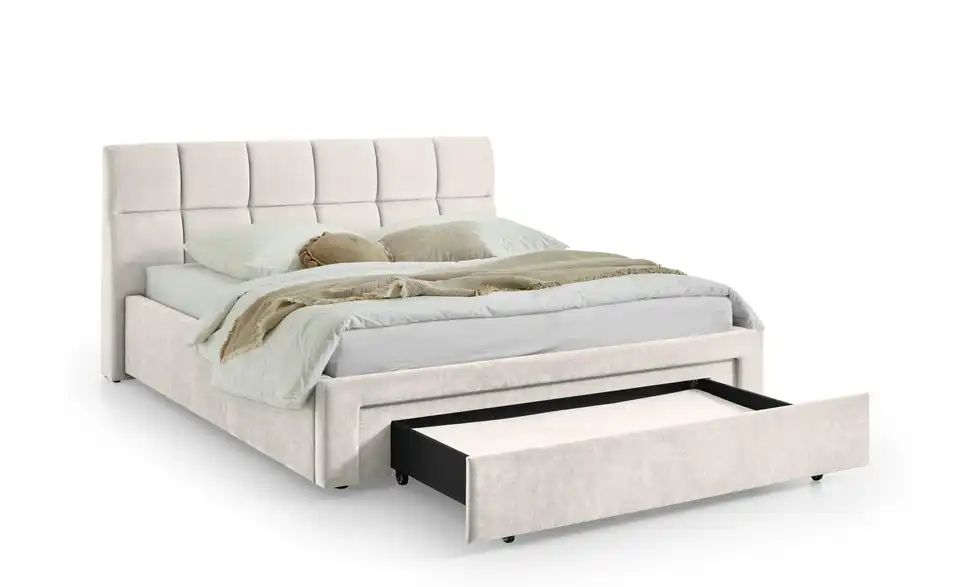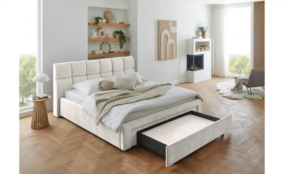 - Lieferumfang / mitgeliefertes ZubehörBeiges Polsterbett 180x200 cm mit Schubkasten inkl. Kissen für Hundebett