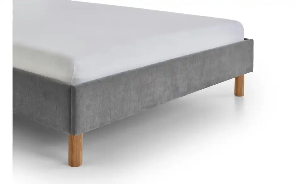 - Lieferumfang / mitgeliefertes ZubehörGraues Polsterbett 140x200 cm mit Holzfüßen, eichefarbig