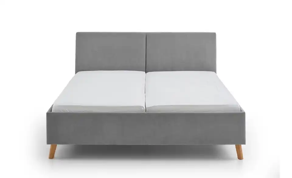 - Lieferumfang / mitgeliefertes ZubehörGraues Polsterbett 160x200 cm mit Holzfüßen, eichefarbig