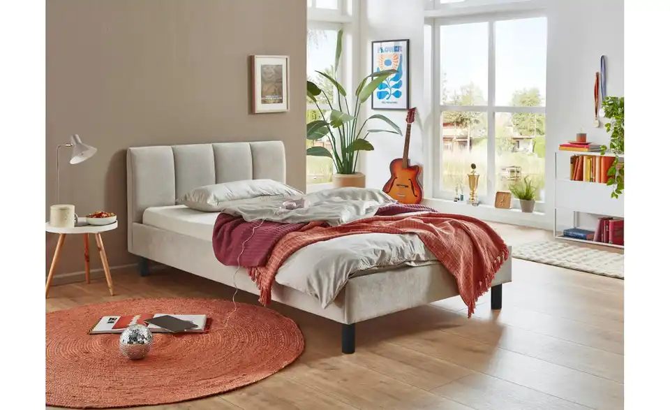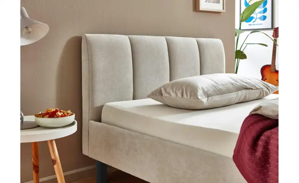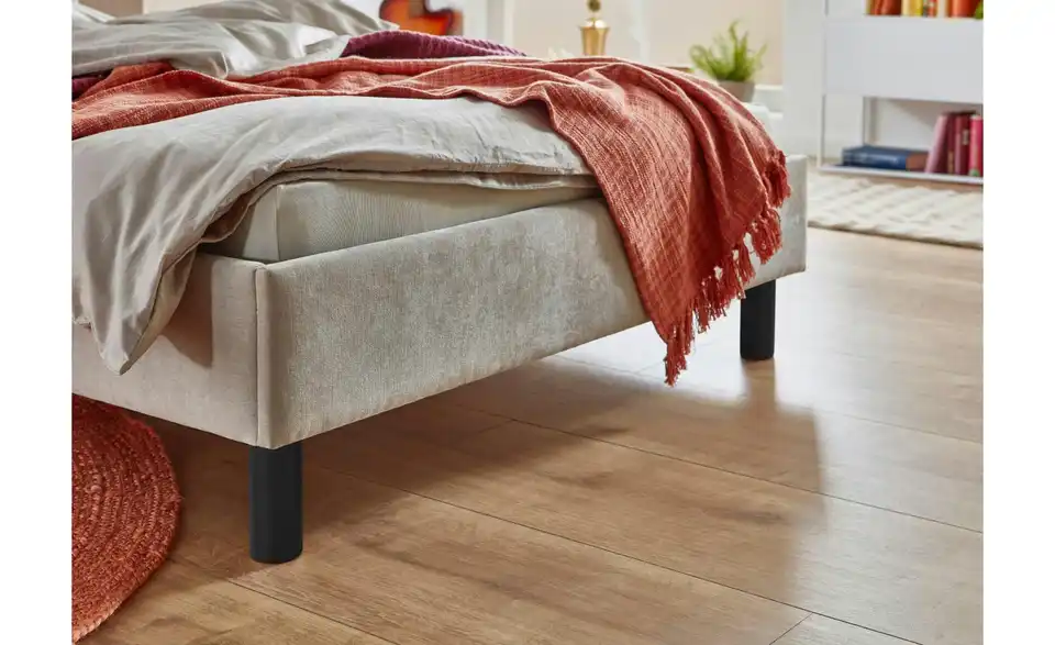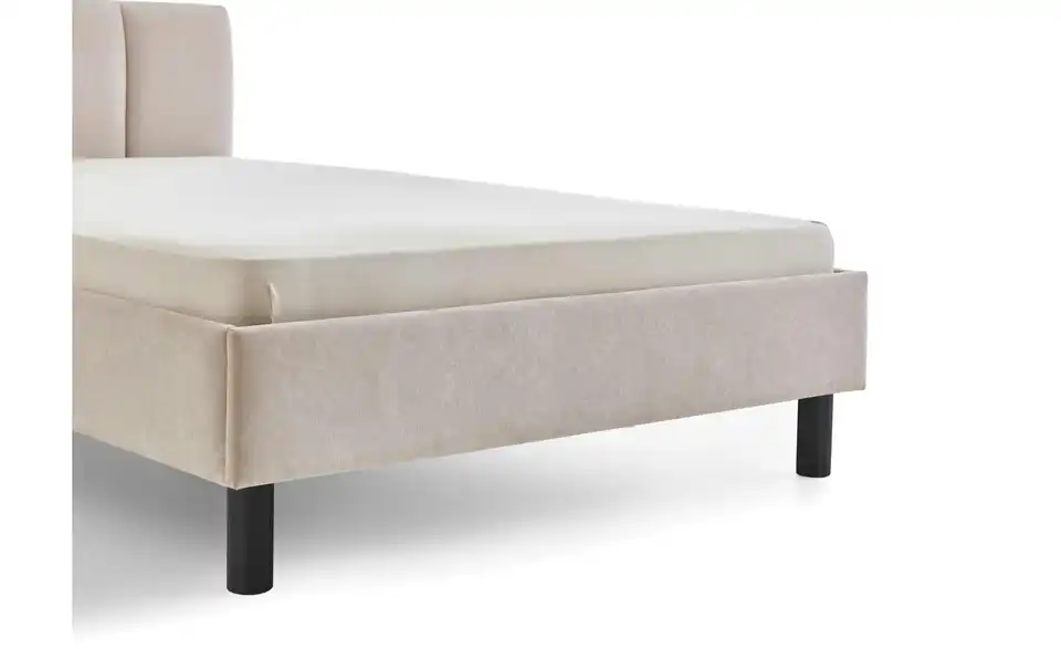 - Lieferumfang / mitgeliefertes ZubehörBeiges Polsterbett 140x200 cm mit Holzfüßen, schwarz