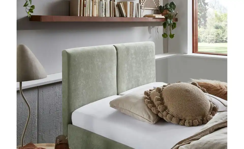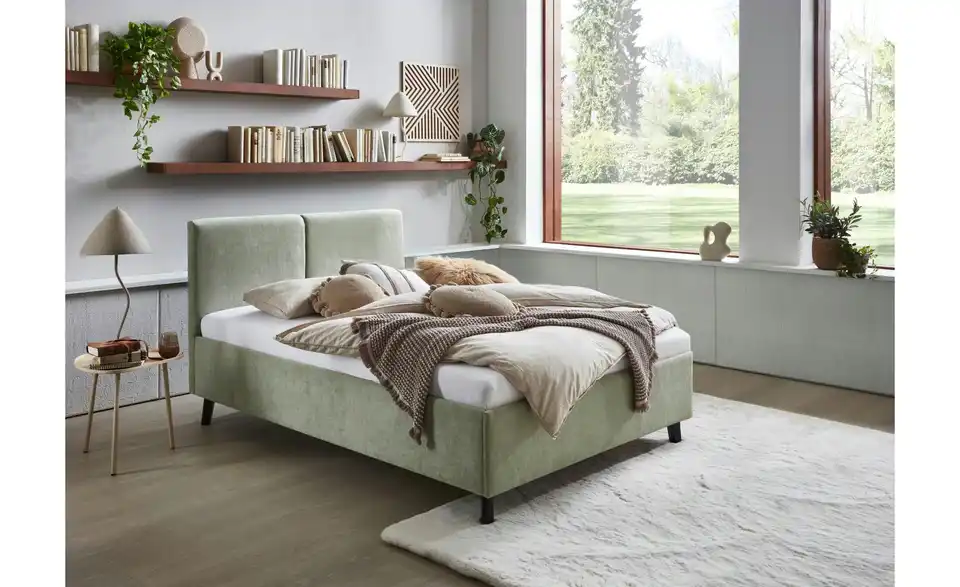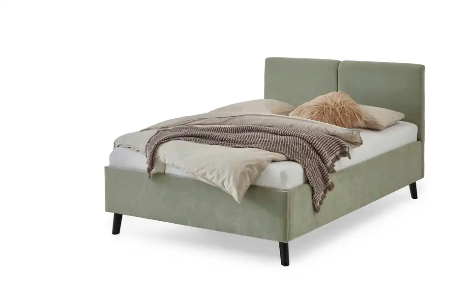- Lieferumfang / mitgeliefertes ZubehörHellgrünes Polsterbett 140x200 cm mit Holzfüßen, schwarz