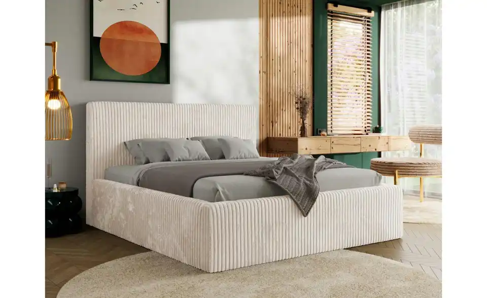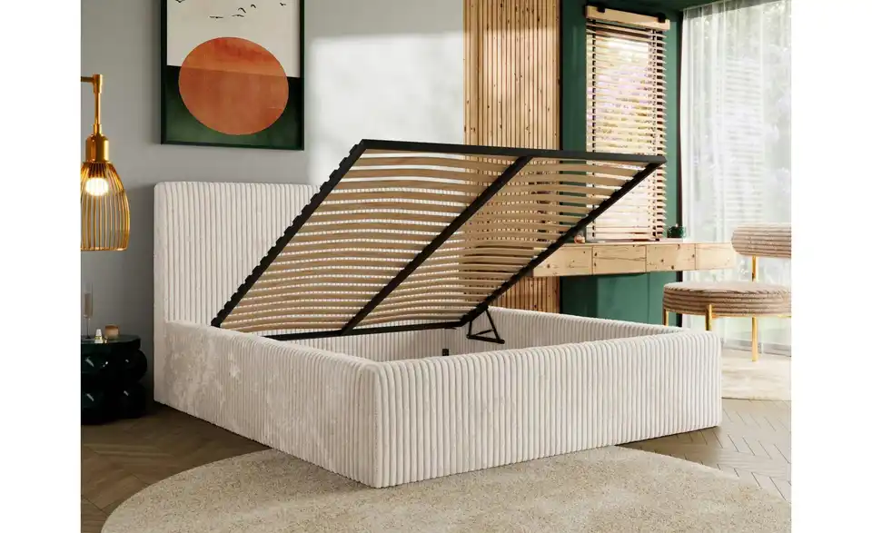 - Lieferumfang / mitgeliefertes ZubehörBeiges Polsterbett mit Bettkasten 160x200 cm