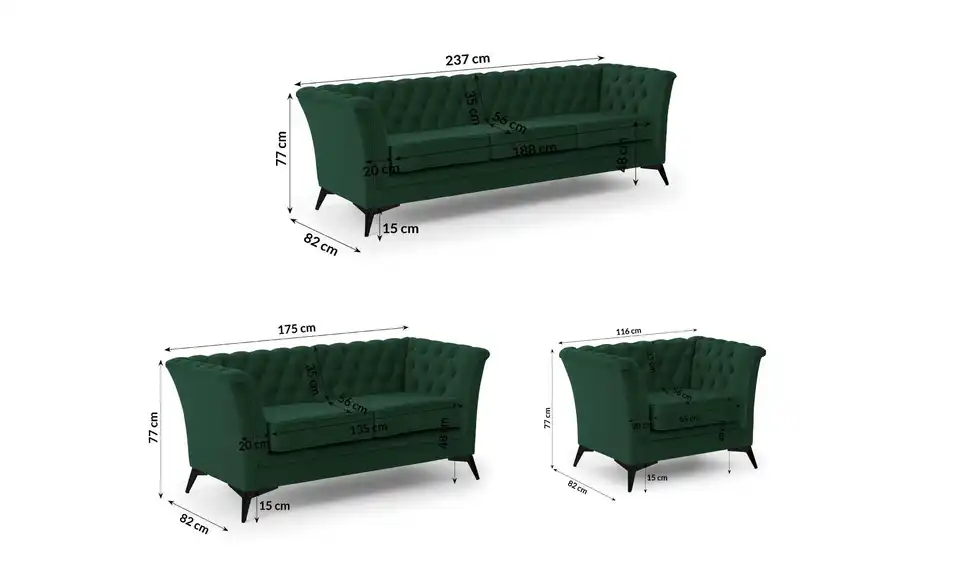 - Lieferumfang / mitgeliefertes Zubehör1 x 3-Sitzer Sofa, 1 x 2-Sitzer Sofa, Sessel, Montagematerial