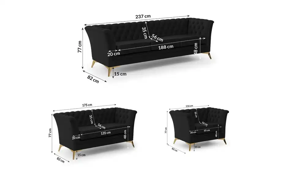 - Lieferumfang / mitgeliefertes Zubehör1 x 3-Sitzer Sofa, 1 x 2-Sitzer Sofa, Sessel, Montagematerial