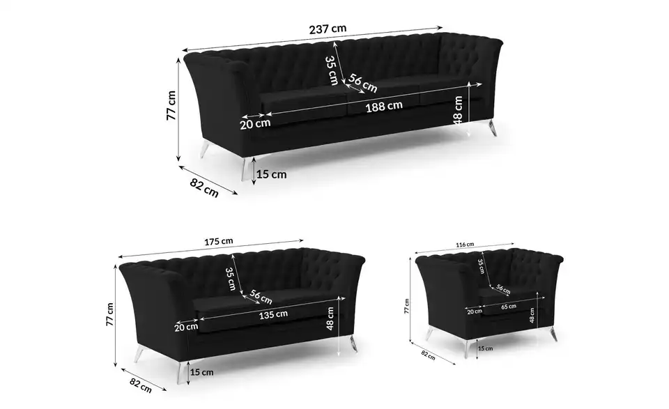 - Lieferumfang / mitgeliefertes Zubehör1 x 3-Sitzer Sofa, 1 x 2-Sitzer Sofa, Sessel, Montagematerial