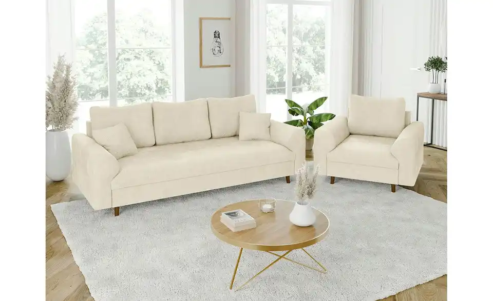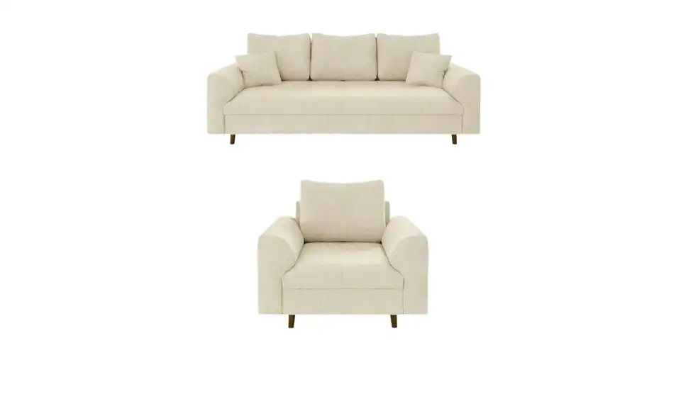 - Lieferumfang / mitgeliefertes Zubehör3-Sitzer Sofa, Sessel, Montagematerial, 2x Zierkissen