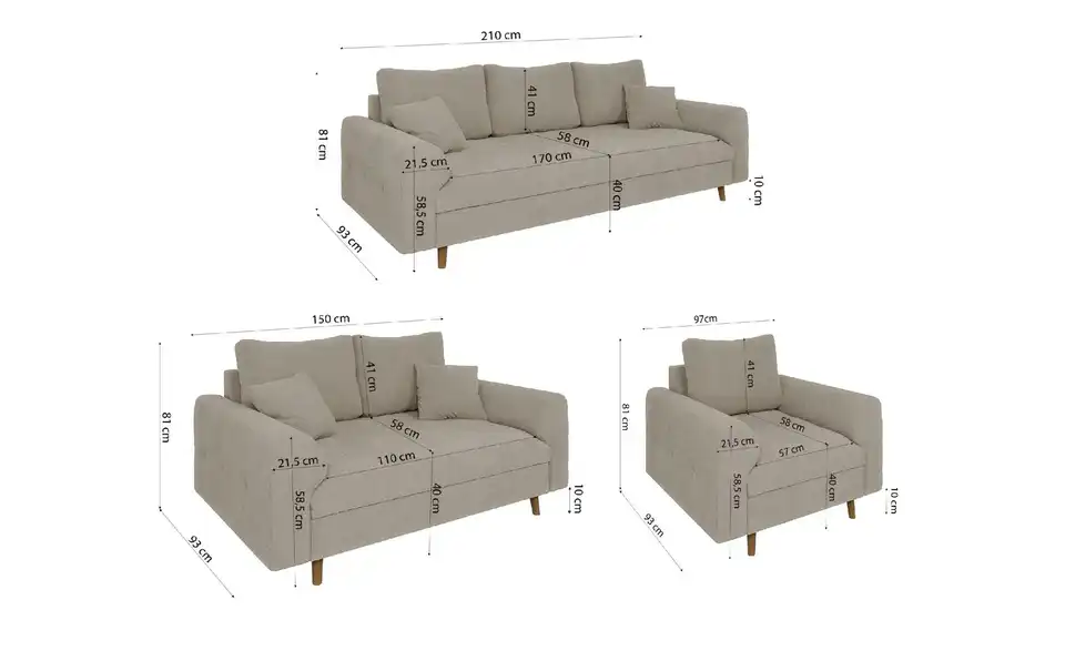 - Lieferumfang / mitgeliefertes Zubehör3-Sitzer Sofa, 2-Sitzer Sofa, Sessel, Montagematerial, 4x Zierkissen
